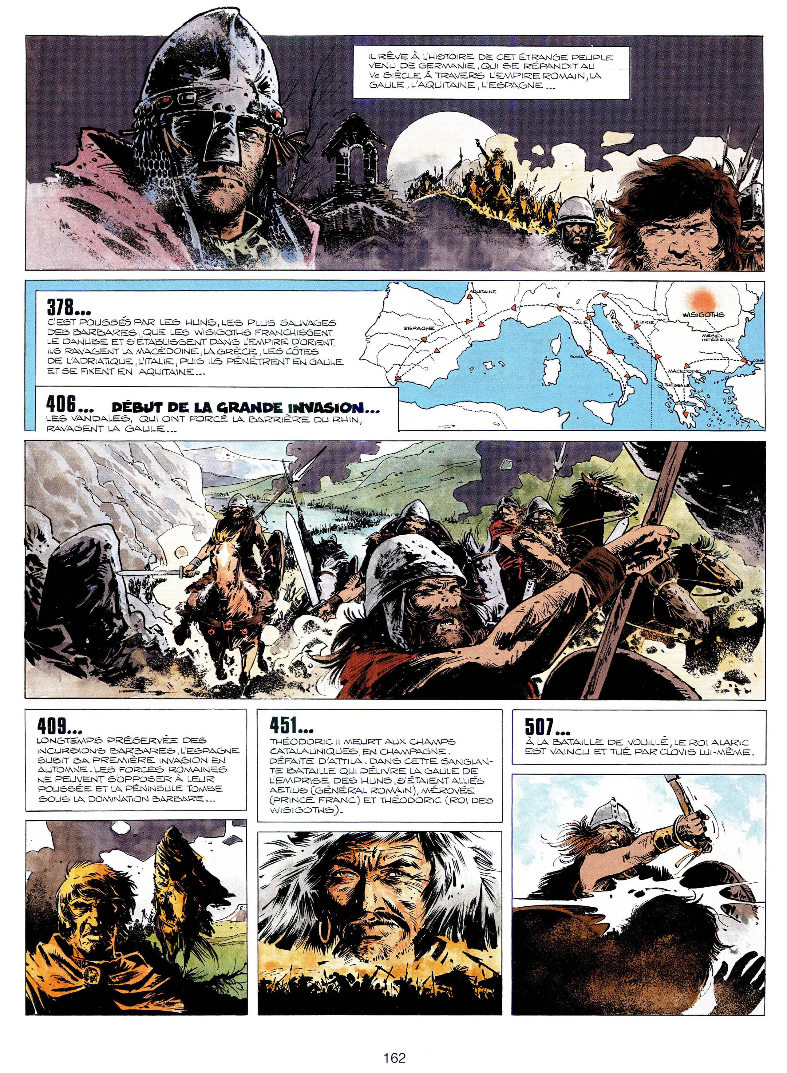Trois évènements fondateurs 1) A la bataille de Soissons, en 486, les Francs commandés par Clovis battent les troupes gauloises de Syagrius, se réclamant de l'empire romain disparu depuis une dizaine d'années. [ci-contre dessin de Julio Ribera 1976 dans L'Histoire de France en BD [17]] 2) Aux alentours de 500, Clovis se convertit au christianisme. Son baptême par l'évêque Rémi, a lieu à la cathédrale de Reims. 3) En 507, Clovis Ier vainc les Wisigoths à la bataille de Vouillé. Il est acclamé par les Gaulois de Tours ("urbs Turonum", anciennement "Caesarodunum") + la planche de la bataille ("L'Histoire de France en BD" 1976, Godard & Ribera [17]).