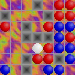 Plateau 7x7 ou 10x10, pions rouges et bleus, départ classique (humain commence en rouge). 15 niveaux. On peut jouer humain contre humain, ordinateur contre ordinateur.