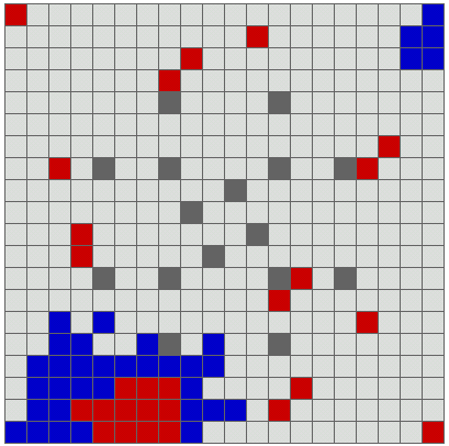 20x20 game, blue and red pieces in classical beginning positions, moves by drag and drop. It is posible to begin with a blue or red piece. Blocks are randomly placed, symetrical or almost.