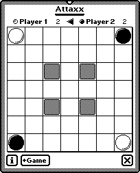 Le Newton est un ordinateur de poche, celui réalisé par Apple, et cet Ataxx (Attaxx, pour se rapprocher d'Attack...) fonctionne sous le système d'exploitation Newton OS 2.x. Il a été écrit par Michael Peay, de San Diego, en Californie. Il travaille chez Gryphon Software Corporation, et aime beaucoup le Macintosh. La date de création est août 1997.