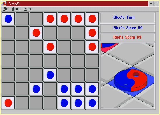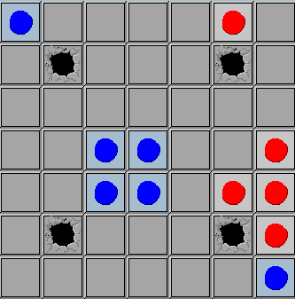 - 7x7 board, blue / red coulours (blue human begins, or red computer). Random blocks appear after first victories. 4 levels. It is possible to play human against human.