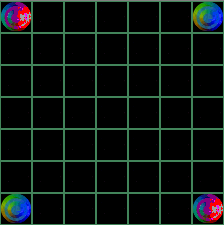 7x7 board. Several sorts of pieces : Standard (see illustration, under), Basic (red and blue colors), Simpsons (2 icons of the US serie), or Renstimp (2 icons of this serie), the first on a black board, the others on a white board. No blocks, music in option.