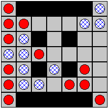 7x7 board, blue and red pieces (red human plays first), random blocks (impossible to choose, alas), 4* levels, auto adjust level*, beginning options (computer first*, 3 pieces against 1*), colours choice*, time limit*, statistics.