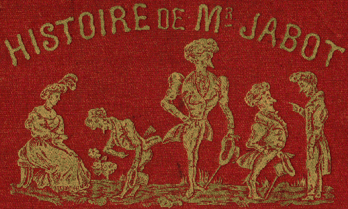 | Si François Caradec et Thierry Groensteen attribuent la date de 1860 aux premières rééditions Garnier, personne ne signale l'album Histoire de Mr Jabot édité, lui aussi en 1860, mais par Caillet (45 rue Jacob). De format 285 mm x 185 mm, épaisseur 30 mm (pages épaisses à la tranche dorée), la couverture est présentée en haut de cette page, l'illustration étant agrandie ci-dessous. | |