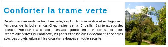 La photo ci-contre (prise à l'exposition située derrière l'hôtel de ville) reprenant deux vue de la Gloriette sur le bord du cher (très excentré), montre qu'il ne s'agit pas de trame verte à travers la ville, mais de continuer à entretenir les espaces verts le long de la Loire et du Cher qui deviendraient donc des "tranchées". Ca devient inquiétant...