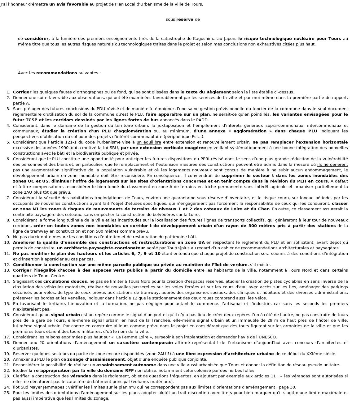 Au delà de ce cas le plus flagrant, il est regrettable que le commissaire-enquêteur ait gobé le langage marketing d'écoblanchiment dans lequel baigne ce PLU, il est regrettable qu'il n'ait fait qu'en effleurer les déficiences, pourtant essentielles. C'est bien joli de parler de trame verte, mais rien dans ce PLU ne montre concrètement qu'elle sera renforcée. Au contraire, il est flagrant qu'elle est détruite sur l'îlot St Lazare, que rien n'est fait pour l'étendre dans les secteurs les plus minéraux, notamment le secteur sauvegardé, et qu'aucun des alignements arborés chers aux Tourangeaux n'est protégé.