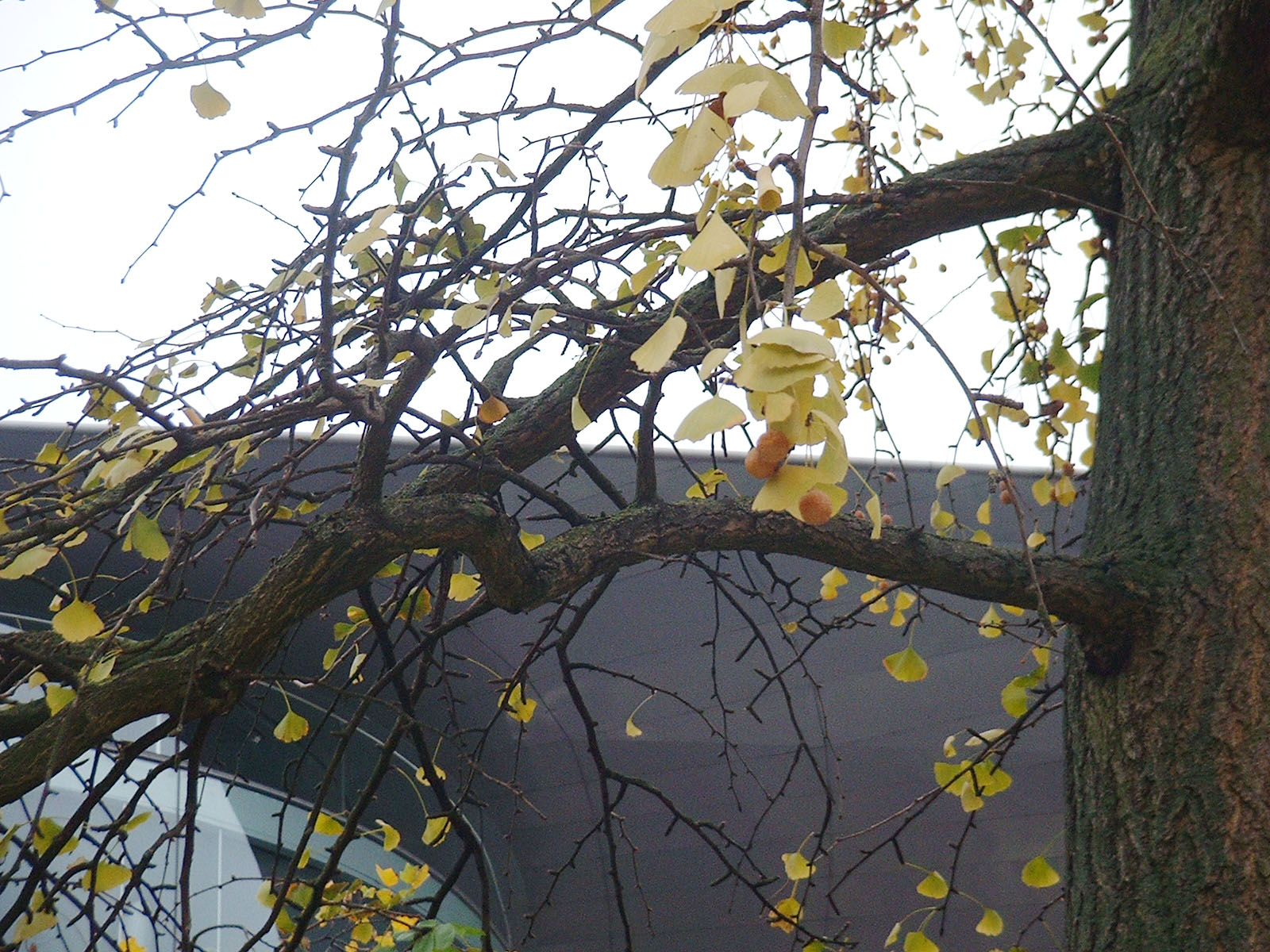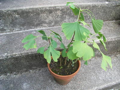 | Un habitant avait ramassé quelques uns de ces fruits malodorants. Des triplés sont nés qui grandissent dans un pot sur le bord d'un escalier. Est-ce tout ce qu'il restera du gingko du jardin de la préfecture ?