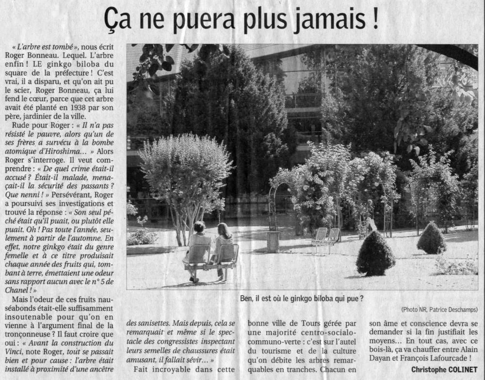 On remarquera que le ginkgo n'était pas juste à la sortie du Vinci. Les quelques jours où l'odeur de ses fruits dérangeait, ce sont les tourangeaux qui attendaient près de l'abri bus qui étaient le plus dérangés. Pendant 70 ans cela s'est bien passé. Il a fallu que quelqu'un au Vinci, un peu plus loin, se rende compte que ça gênait quelque congressistes de passage (lesquels n'auraient d'ailleurs jamais demandé à abattre l'arbre !)... La plainte de cet imbécile au bras long a été prise en compte par la municipalité, soucieuse de ce que l'ultra-centre soit "clean" et aseptisé... Pourquoi donc le service des espaces verts a-t-il été incapable de défendre un tel arbre ? Pourquoi a-t-il laissé faire ça en catimini ? Pourquoi ?