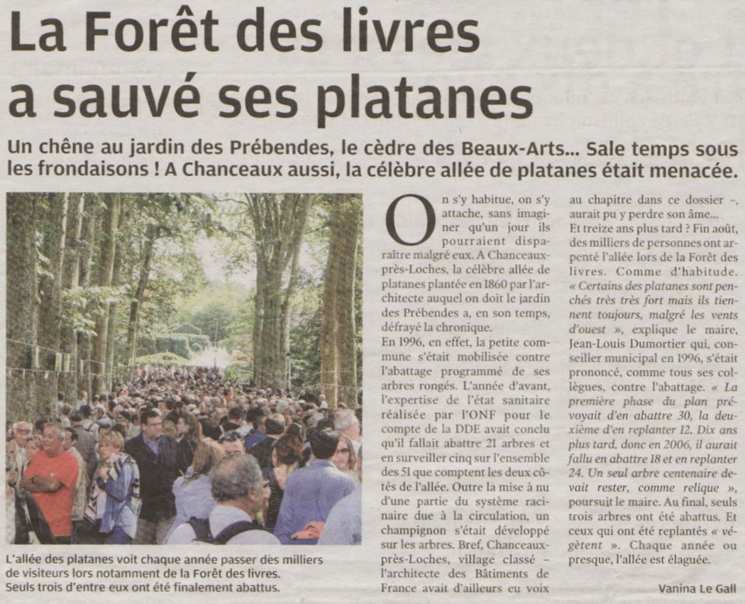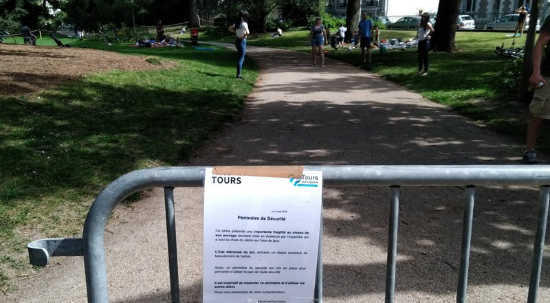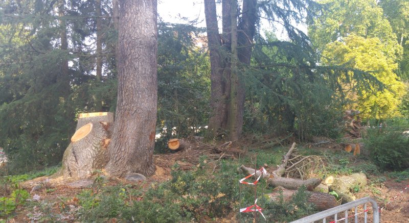 Septembre 2017, jardin des Prébendes. Au passage, on lit que ça déplaira aux "défenseurs de arbres", comme si ceux-ci étaient des attardés n'ayant pas le sens des responsabilités. Je le dis ici avec colère : les extrémistes sont ceux qui abattent tous les arbres sous prétexte que quelques uns sont dangereux. En ce sens, Madame Myriam Le Souëf, adjointe au maire en charge des parcs et jardins, Madame Christine Chasseguet, directrice du service parcs et jardins, et Monsieur Jac Boutaud, responsable du patrimoine arboré de la ville et - à mon sens - la caution scientifique de la municipalité, sont des extrémistes qui nous baratinent quand ils prétendent aimer les arbres. Les "défenseurs des arbres" ont une vision beaucoup plus nuancée. Ils comprennent qu’on puisse être amené à abattre certains sujets jugés dangereux. Encore faut-il présenter précisément les risques. Tout n'est pas noir ou blanc, d'un côté les méchants arbres et de l'autre les gentils. Il y a plusieurs degrés de dangerosité. Abattre les plus menaçants, voir comment évoluent les autres, en restant vigilant. Mettre en place des protections là où c'est possible. Considérer qu'un arbre malade n'est pas toujours dangereux et peut encore vivre longtemps. Ces nuances semblent absentes de l'état d'esprit des gestionnaires des arbres municipaux, qui en cachent les nuances en ne montrant pas l'expertise. L'opacité de la procédure et l’instrumentalisation de la presse sont des signes de l'arbitraire... Supposons même que les analyses effectuées donnent les résultats très sévères, tels qu'ils sont exposés dans la NR : "Six sur huit ont montré des faiblesses. [...] Les deux autres sont en relative bonne santé, mais, situés à côté de sujets qui doivent être abattus, ils risquent de perdre en stabilité". Quel risque ? On vient d'abattre un platane en face de la gare, boulevard Heurteloup, (on ne sait trop pourquoi, la base du tronc est saine), faut-il tout de suite abattre ses voisins qui risquent d'être déstabilisés ? Quel est ce "principe de précaution" qu'on utilise de façon arbitraire ici et pas là ? Et pas dans les autres communes ? Ne vaut-il pas mieux attendre d'être sûr qu'ils soient déstabilisés avant de leur appliquer la solution fatale ?