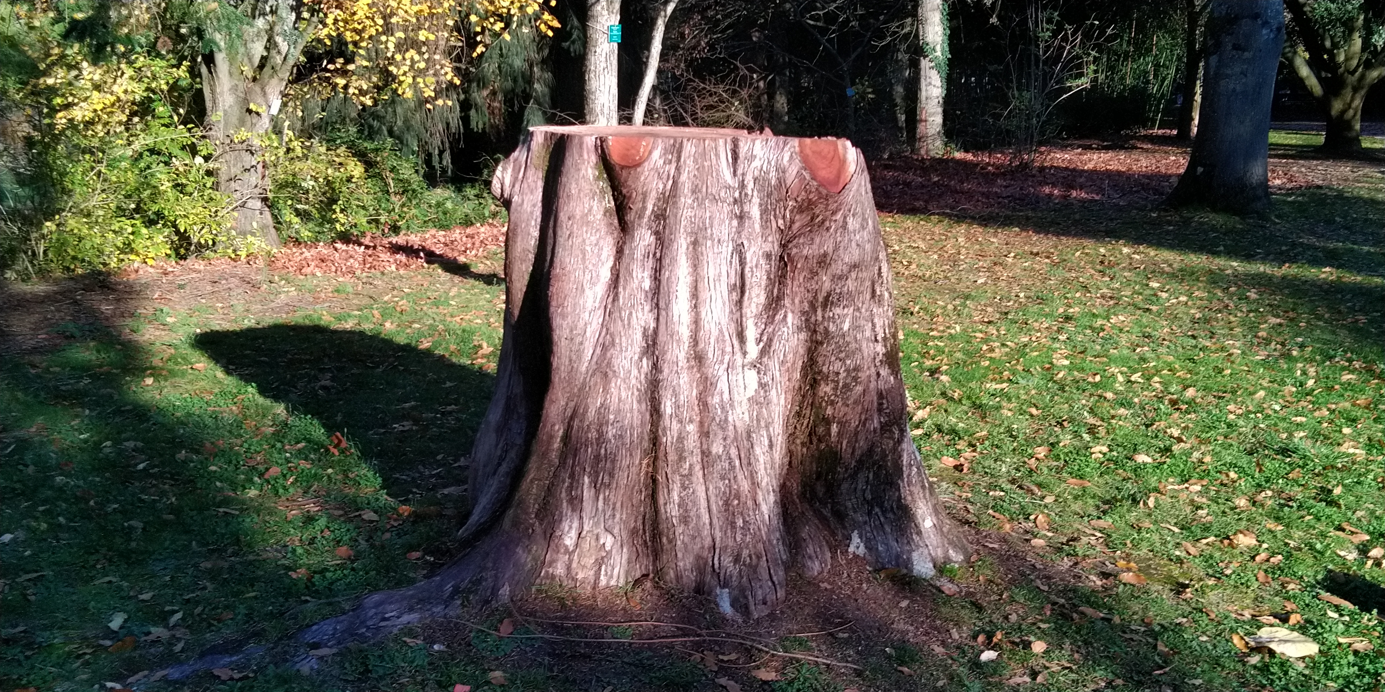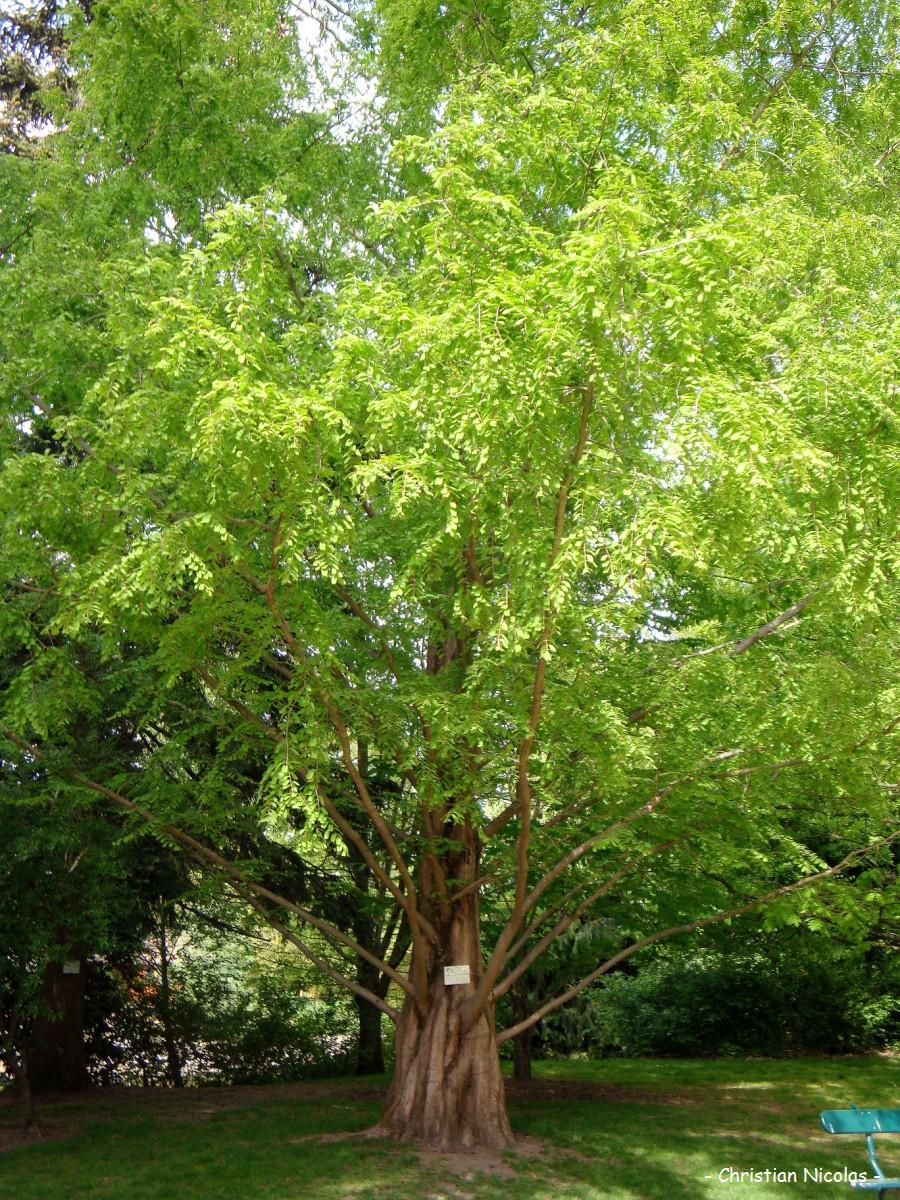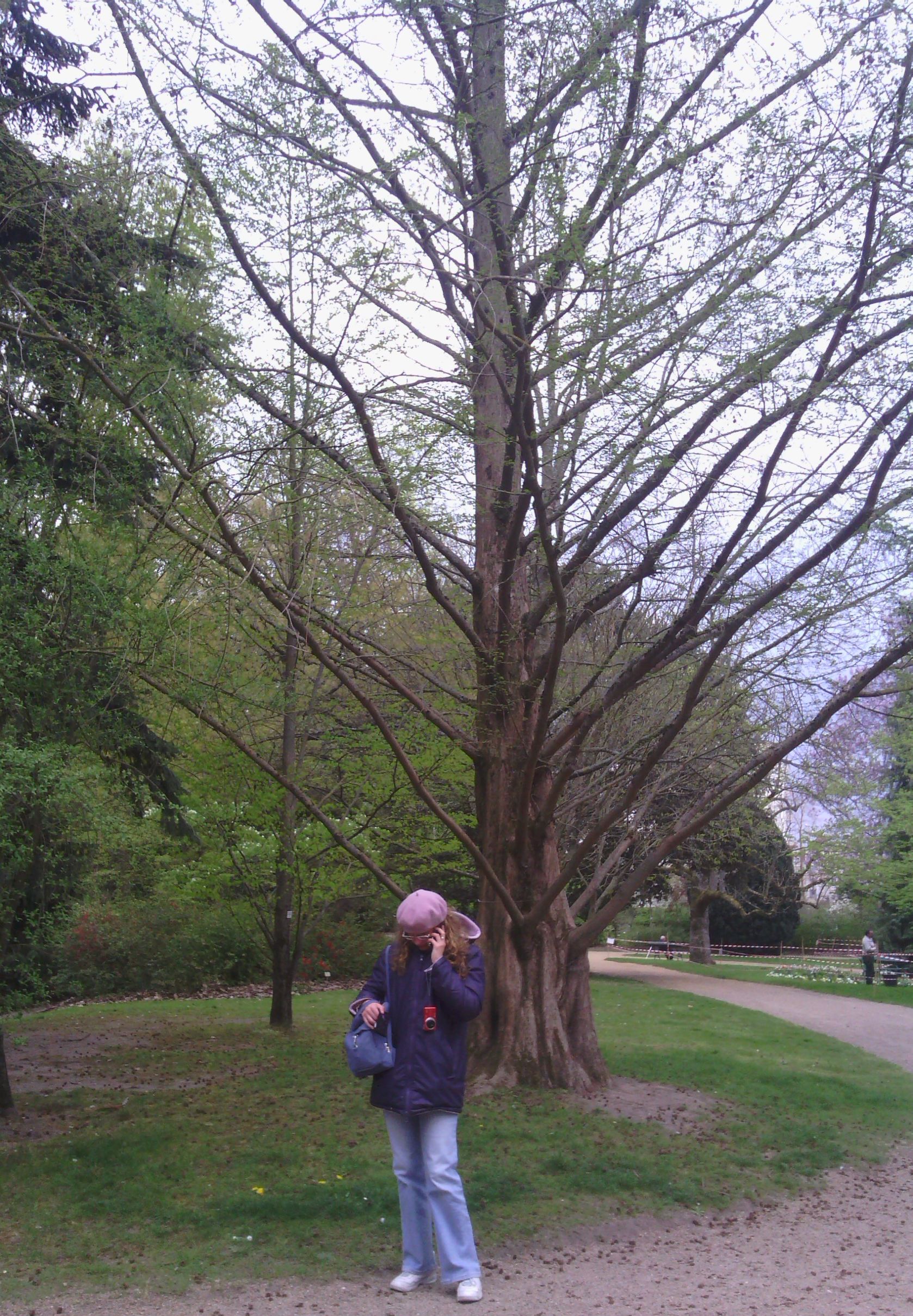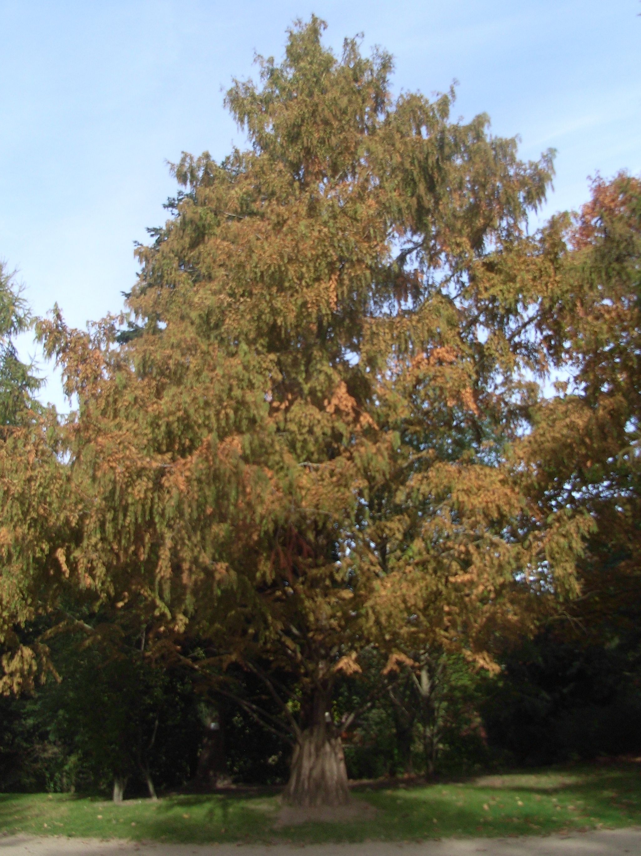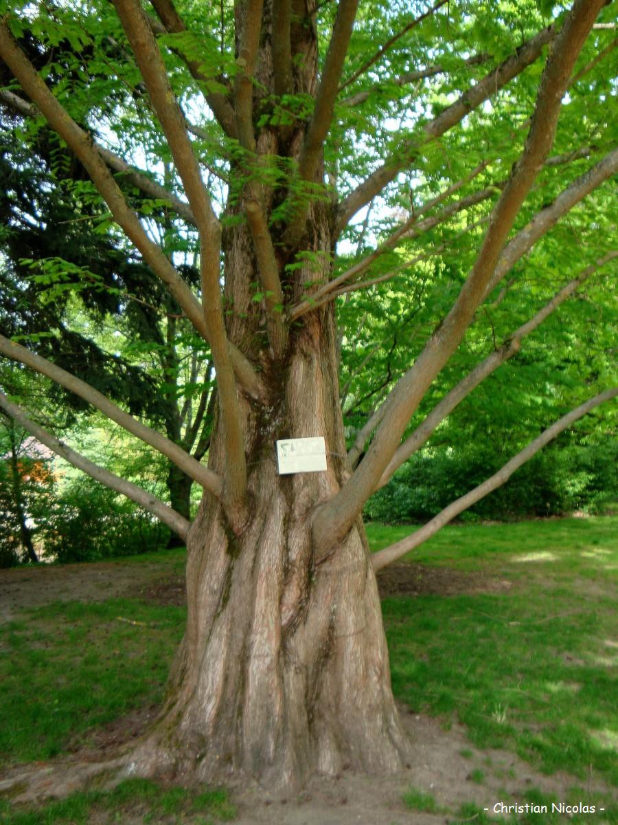Photos de 2004 (lien) et de 2008 (Wikipédia lien) Il est un des trois conifères à épines caduques, avec le mélèze et le cyprès chauve. Celui-ci était beau et bien placé. L'abattage a eu lieu en 2023, de façon très discrète. Je l'avais vu en novembre 2022 sans rien remarquer, comme d'habitude... La coupe ne montre aucune anomalie (photos de novembre 2023) :