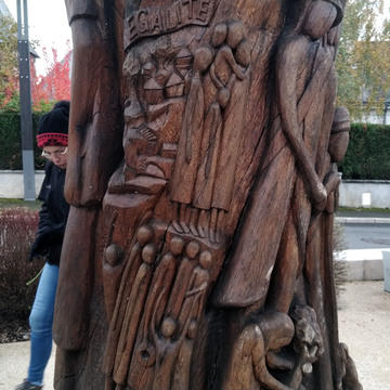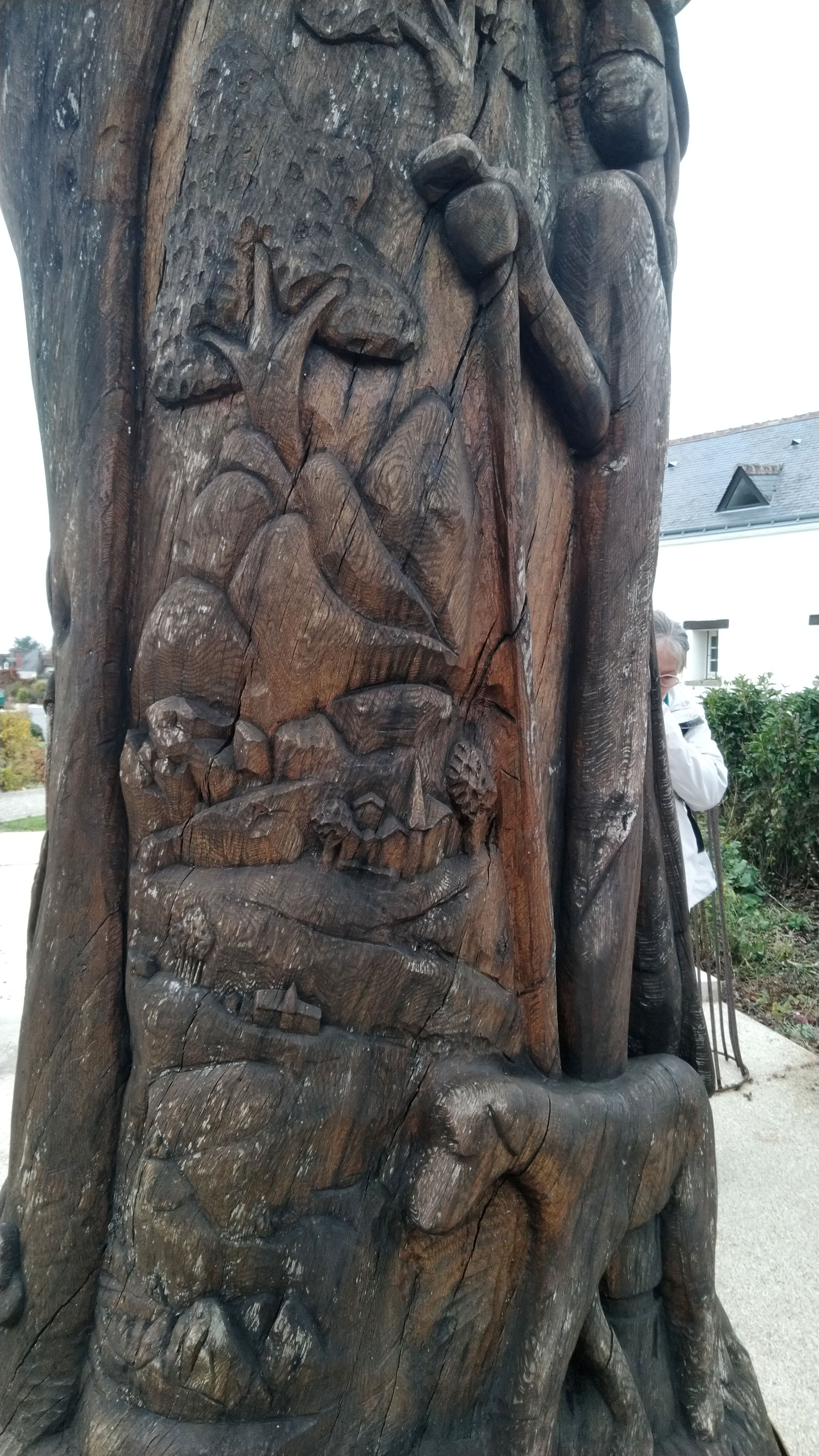 Photos de 2023. Page sur le chêne de Saint-Roch, chêne pédonculé planté en 1790 comme arbre de la liberté. Autres pages : 1 2 3. Vers 2008, le conseil municipal a décidé de le transformer en statue, pour ainsi "redonner une nouvelle vie au vieux compagnon". Un arbre mort peut être un habitat pour les oiseaux et les insectes, il peut servir de support pour des plantes grimpantes (lien). Il faut savoir que, plutôt que d'en venir à des méthodes expéditives, on peut prendre soin des arbres mal en point et en sauver une bonne partie. Dans mon livre, je montrais un exemple que je trouve emblématique, à Chanceaux près Loches, l'allée de platanes de La forêt des Livres :