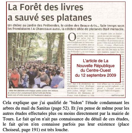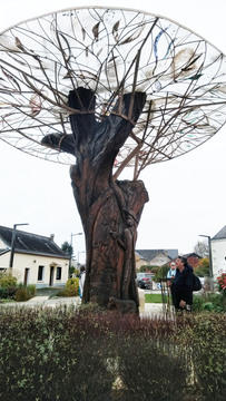 2009, jardin botanique, abattage d'un arbre avec de belles feuilles, un beau tronc, de belles branches, en un lieu pour animaux, interdit au public. 2002, jardin des Prébendes, un superbe poncirus. Il a été abattu sans qu'on le sente venir. Etait-il dangereux ? Il n'y a plus de poncirus dans les jardins publics de Tours (autre photo de cet arbuste, à Nantes). Ces arbres ne sont pas seulement ceux du service des parc et jardin, ils sont ceux des Tourangeaux, ils sont des végéraux amis que nous apprécions et que nous voudrions voir traités avec attention. Nous voudrions les voir vieillir plutôt qu'être euthanasiés dès que quelque choses ne plaît pas à ceux qui s'estiment experts et n'ont rien à cirer d'un arbre malade. Pourtant, nos compagnons végétaux peuvent parfois mettre un ou plusieurs siècles à mourir et même sans être dangereux. Je veux dire par là que, même si le métaséquoia était mort pour ne pas avoir recréé ses épines au printemps dernier, il ne fallait pas l'abattre aussi rapidement. La coupe saine de son tronc, sa base conséquente, son système racinaire important montrent qu'il n'était pas dangereux à court terme, on pouvait donc le laisser ainsi pendant quelques années (voire planter un autre métaséquoia à côté, comme s'il y avait une passation de relais) et l'abattre ensuite. C'est un arbre extraodinaire, par son histoire et par son allure à nulle autre pareille. Les Tourangeaux pouvaient être fiers d'avoir un si beau spécimen, le seul dans la ville. Cela fait maintenant une quinzaine d'années que je suis attentif à ce phénomène et je l'affirme sans ambage : il y a dans la mairie de Tours, notamment dans le service Parcs et Jardins, des "assassins d'arbres". Des tueurs en série. Je ne parle pas des manieurs de scie mais de ceux qui décident la mort. Ils font souvent leurs coups en douce, parfois communiquent en prétendant, à tort ou à raison, qu'il n'y a pas d'autre choix... Quand donc seront-ils mis hors service ? Hors sévice... Il y a certes eu quelques progrès avec l'élection d'un maire d'un parti écologique, il a entendu la mobilisation populaire pour sauver les arbres du boulevard Béranger (lien Aquavit), il fait des plantations bienvenues, mais il n'a pas évincé les assassins en série... Dans les futures victimes, on a les alignements d'arbres de l'avenue Jean Royer pour faire place à un tramway dispendieux dont le coût serait beaucoup plus utile à régénérer l'étoile ferrovière (communiqué Aquavit du 20 juin 2023). Ces arbres ont été plantés assez récemment, mais comme l'indique le titre de mon livre, à Tours on ne les laisse pas viellir... Y compris quelques uns des plus beaux specimens de nos plus beaux parcs. Ne croyez pas pour autant que je suis jusqu'auboutiste. Je sais qu'un arbre peut devenir malade, qu'il peut mourir, qu'il peut devenir dangereux, je sais que certaines circonstances peuvent amener à l'abattre, j'en ai moi-même abattu (en fait des arbustes - moins de 7 mètres). Mais on peut le faire d'une manière beaucoup moins expéditive. Si c'est possible (c'est-à-dire s'il ne devient pas dangereux), on peut laisser un arbre mourir. D'ailleurs, c'est ce qui se fait actuellement au jardin des Prébendes où chacun peut voir que depuis un ou deux ans deux séquoias sont moribonds. Si j'avais vu l'an dernier que le métaséquoia était mort , je ne m'exprimerais pas de la même façon aujourd'hui. Il était quand même moins dangereux qu'un séquioa beaucoup plus âgé et haut (donc potentiellement plus dangereux), il n'y avait pas urgence. Il faut laisser le temps au public de s'habituer à la mort de ses amis végétaux. Et même, pour certains cas, on peut garder la carcasse morte et en faire une oeuvre d'art. Je l'ai vu récemment dans une commune proche de Tours, Saint-Roch :