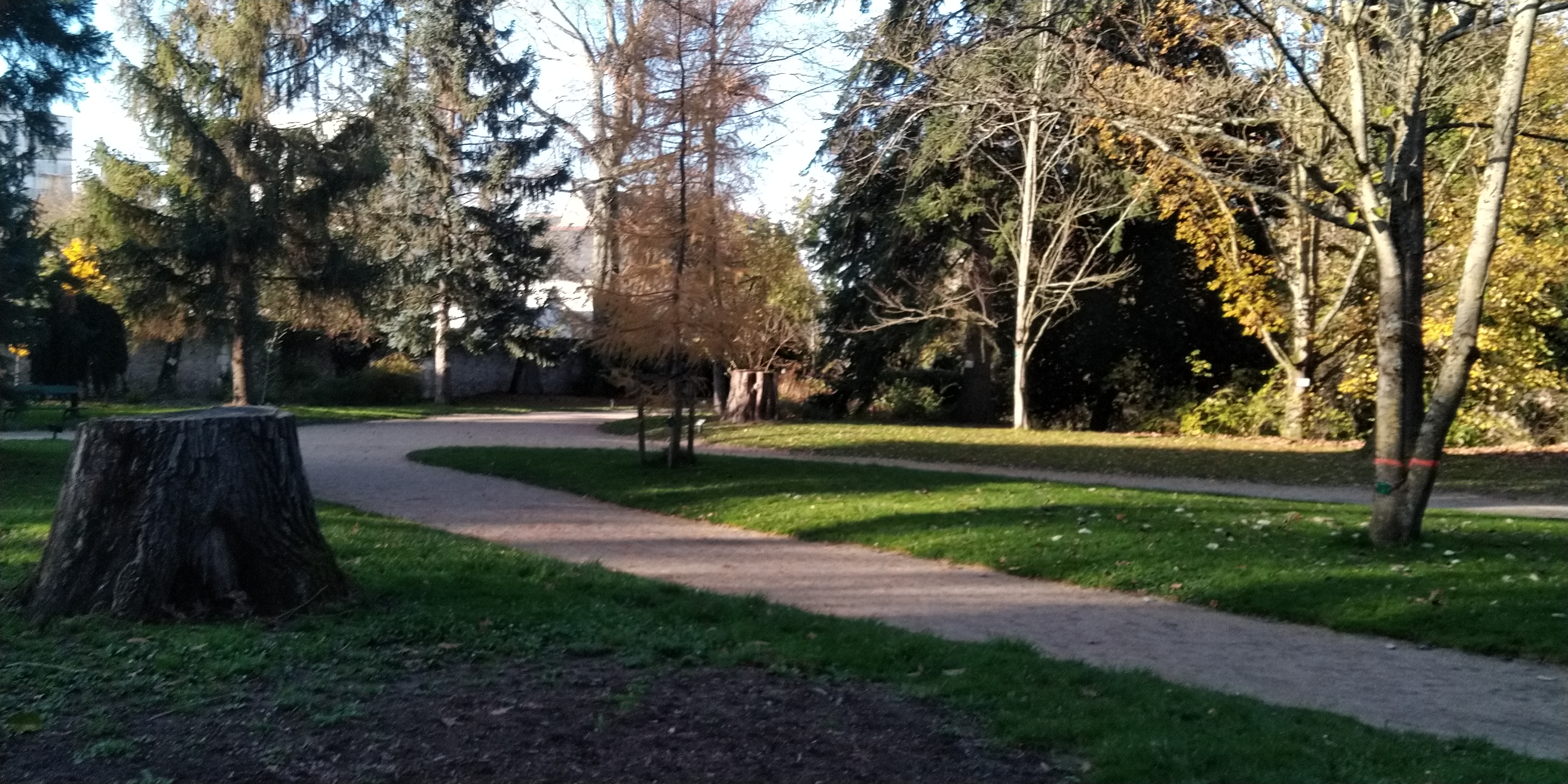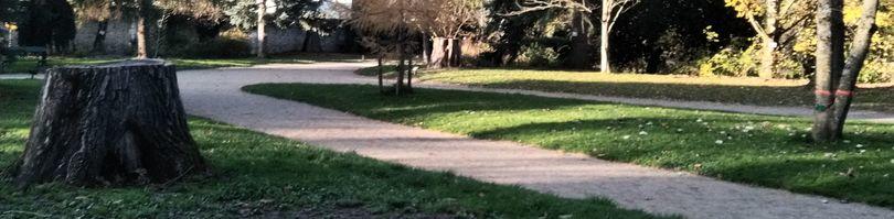 Au fond, au centre, le métaséquoia coupé, au premier plan un autre arbre coupé, à droite un arbre marqué de rouge, promis à l'abattage. Novembre 2023. Peut-on croire que, dans un espace aussi réduit, il soit justifié d'abattre trois arbres ?