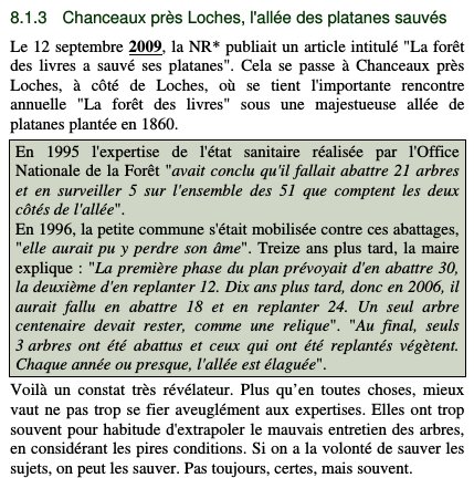 3 arbres abattus, au lieu des 18 prévus. Quand on veut, on peut... Il existe plusieurs techniques de consolidation, par exemple le haubanage. Il faut agir au cas par cas... Les arbres sont des êtres vivants, à haute intelligence, comme les humains et certains animaux, même si c'est de façon très différente. Ils sont les végétaux les plus développés, des bienfaiteurs de l'humanité, de notre environnement, de la vie sur terre. Je rappelle le premier conseil du célèbre botaniste Francis Hallé : respectons les.