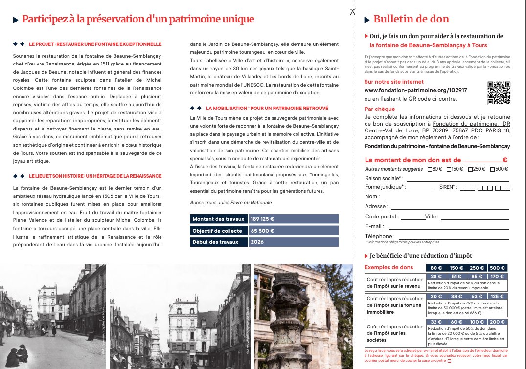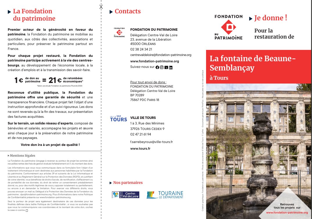 Il y a vingt ans, on entrait dans la mairie de Tours (le bâtiment administratif), comme on voulait. Puis le maire de l'époque, Jean Germain, a imposé une fouille des sacs quand le citoyen, au-delà de l'accueil, allait à l'étage. On croyait alors que ce serait provisoire. Progressivement, la fouille des sacs s'est imposée sur tout ce qui était extérieur à l'accueil. Les changements de maires n'ont fait qu'aggraver la crainte sécuritaire d'une agression par un citoyen mal intentionné. Une étape a été franchie, avec le maire actuel, Emmanuel Denis, pour fouiller les sacs avant d'arriver à l'accueil. Il restait encore le petit hall d'entrée où on pouvait encore trouver les publications municipales (culturelles et autres) sans se faire fouiller. Sur la photo ci-dessus (lien), on distingue les deux présentoirs à documents. Mais, pour les obsédés de la sécurité, c'était encore trop dangereux. Ils ont retiré les présentoirs à l'intérieur, pour qu'ils ne soient accessibles qu'après fouille des sacs. C'est dans ce contexte que, n'ayant pas connaissance de ce dernier durcissement, je suis allé en mairie chercher un dépliant culturel, fin juillet 2025. Je pensais trouver ce document dans l'un des deux présentoirs dans le hall. Plus de présentoirs. J'entre donc et je me fais interpeller par un agent de sécurité qui m'ordonne d'ouvrir mon sac. Je lui réponds que je viens juste chercher un prospectus et que je repars. C'est interdit : il faut d'abord être fouillé pour arriver aux présentoirs. J'élève la voix et je m'insurge. Rien à faire. Je m'exécute. Et je ne trouve pas de présentoir. Ah, si, là... Je dis qu'avant il y en avait deux à l'accès immédiat. L'autre est dans la direction opposée (pourquoi les avoir séparés ?). Je ne trouve pas mon document dans ces deux présentoirs. Je m'adresse à l'accueil. Le document en question est un bon de souscription pour une opération de mécénat citoyen afin de financer la restauration de la fontaine de Beaune Semblançay. Je dis que j'ai vu ce document sur Internet et que je le veux en papier pour souscrire. La personne à l'accueil cherche partout, ne trouve pas. Elle finit par trouver l'adresse Web avec le document et me l'écrit sur un papier. Là, je recommence à élever la voix. Bien sûr que je la connais cette page, puisque c'est pour l'avoir lue que je suis ici ! Il est quand même incroyable que personne ne puisse trouver cela ! Je finis par dire que je repasserai dans une demi-heure, le temps que ce document soit trouvé. Non, non, du secours vient en renfort, ils vont trouver... mais ne trouvent pas. Une demi-douzaine de personnes de la mairie m'entourent, dont la moitié d'agents de sécurité. On m'intime de parler moins fort. Exactement ce qu'il ne fallait pas faire. Et là, on m'entend de partout. Non, je ne me tairai pas. Il est inadmissible qu'on accueille les citoyens comme des terroristes. Il est inadmissble que lorsqu'on veut donner de l'argent à la mairie, on se fasse accueillir de la sorte ! Quelqu'un a tout de même trouvé le document et ça s'est terminé là. Une mairie devrait être un lieu accueillant et non de suspicion systématique. Ci-dessous, le document que je cherchais, recto et verso :