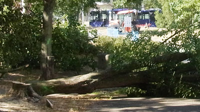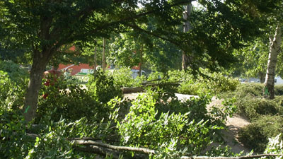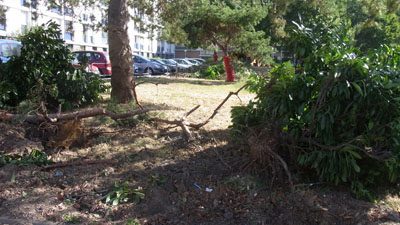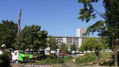 Après un été marqué par des coupes isolées un peu partout (notamment au Sanitas), le massacre du jardin Meffre a commencé hier et prend aux tripes. Un beau panneau indique l'effort de concertation et de mieux vivre de la Ville de Tours. Les habitants plaisantent avec les ouvriers.