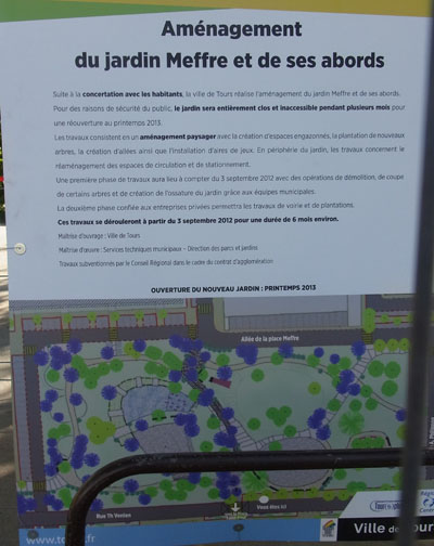 [Reprise d'un paragraphe de la page 119 du livre] Le bulletin municipal Tours Infos n°132 de décembre 2011 annonce la rénovation du jardin Meffre (créé en 1982), le plus grand jardin du Sanitas, à l'est de l'église Saint Paul. Tout est à craindre derrière la comm' : "un espace planté, tout en transparence", "des surfaces en pelouse à l'échelle du jardin en petits espaces protégés, un lieu pour l'eau et le jardin aquatique". Pas de doute, le jardin "à la Royer" trop épais et consistant va laisser place à un jardin "à la Germain" ouvert à la vidéosurveillance déjà en place (deux caméras trop gênées par les branches…). Pourtant ce jardin, avec un seul peuplier et des plantations d'une dizaine d'années, a visiblement déjà été diminué en hauteur (effectivement, en 1998 d'après Tours Infos n°12).