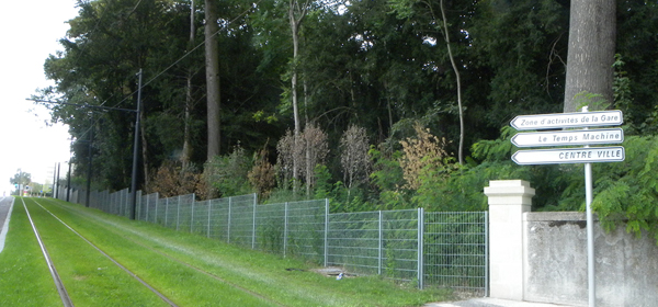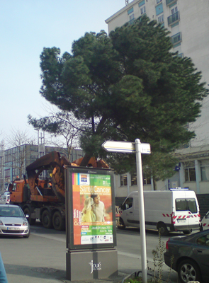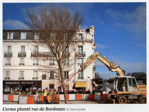 Planté au début du printemps, il est mort en juillet... "Par sa taille, c'est l'une des plus belles pièces des 2319 arbres plantés", "La nouvelle perspective, ouverte par la disparition de l'îlot Vinci, apportera un point de vue de verdure" signale (en sa page 55) le numéro spécial NR du Tramway de ce mois d'août, dans l'ignorance de la disparition de l'unique point de verdure de ce début de rue de Bordeaux. Le pauvre orme était noyé dans une étendue de pavés chinois tout gris, tout gris. C'est "trop minéral, presque déshumanisé", "très vide, un brin soviétique" (commentaires de lecteurs de la NR du 20 août), il y avait de quoi être dépressif. Et pas de chant d'oiseaux, pas de bourdonnements d'insectes, un Mac Do à côté... Seules de grosses chenilles grises à sept anneaux passent à côté en grinçant des mécaniques. Il n'y a que la gare qui soit belle, très belle même, mais la vue allait bientôt être complètement gâchée par des hautes tours Bouygues ! Oh la la, quel monstrueux contraste, quel désespoir... Pauvre orme, il n'a pas pu le supporter... A moins qu'on ne l'ait suicidé ? |