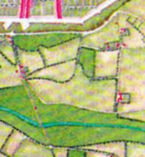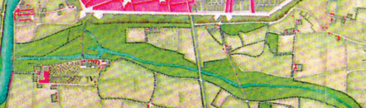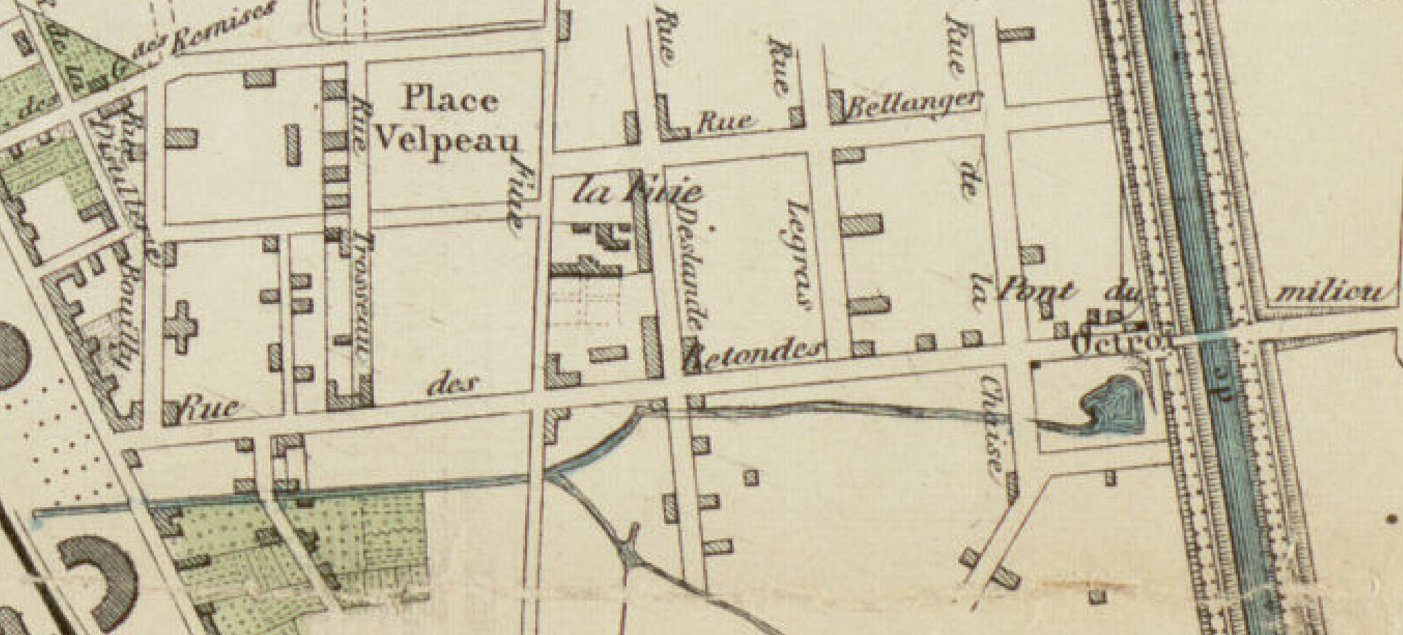 Ci-dessus, extrait d'une carte de Tours du début du XXème siècle, avant que les reconstructions d'après bombardements reconfigurent le bâti : le ruisseau (en bleu) traverse le terrain du promoteur (en orangé) en son milieu.