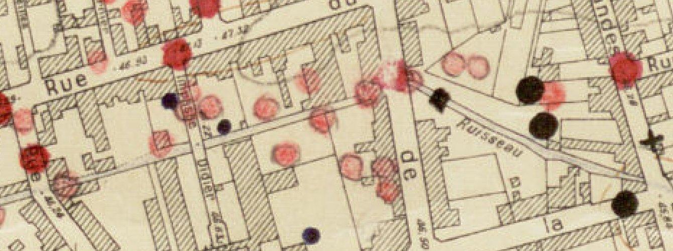 - le danger a été aggravé par les bombes tombées en 1944, dont on méconnaît les conséquences sur le ruisseau. Il y a lieu de s'inquiéter de l'état des canalisations. Voici trois cartes : 1 les canalisation détruites (en bleu les eaux, en rouge les égouts, en vert le gaz), 2 les impacts de bombes (ci-dessous) (en rouge les bombes éclatées, en noir les bombes non éclatées), 3 les zones sinistrées (en rouge les immeubles détruits, en bleu les immeubles endommagés) (sur 16.3000 immeubles dans la ville, 3.026 avaient alors été sinistrés, près de 1/5ème de la surface nette).