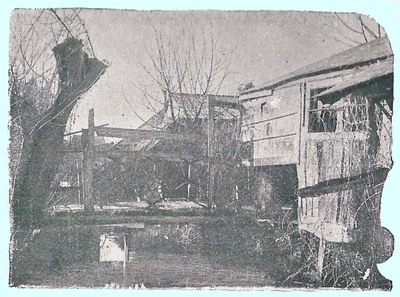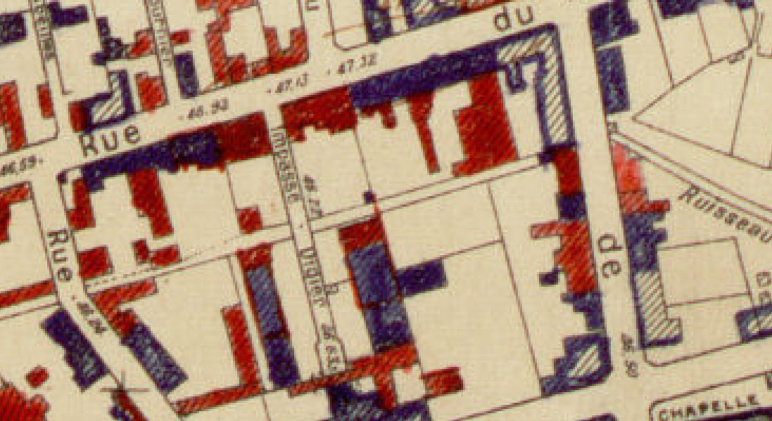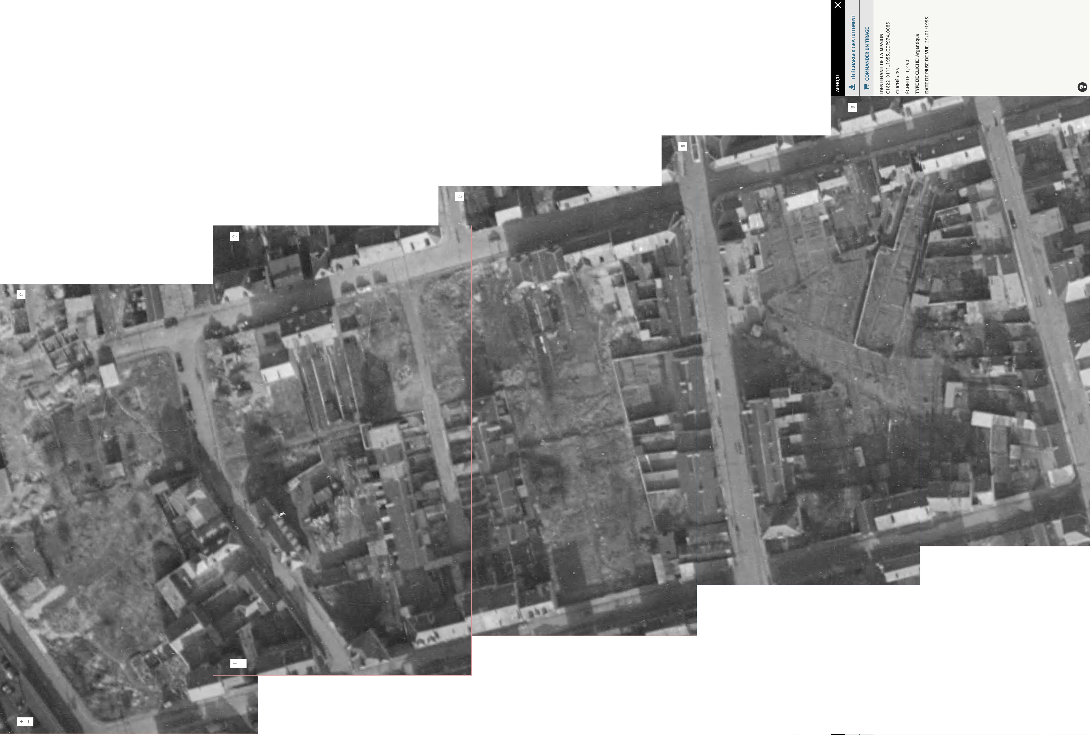 Ci-dessus photo aérienne de janvier 1955. Le quartier est alors dévasté par les bombardements de 1944, les décombres sont dégagés, le ruisseau est enterré, les nouveaux bâtiments ne sont pas encore construits. On devine la dépression par où passe le ruisseau.