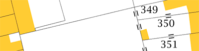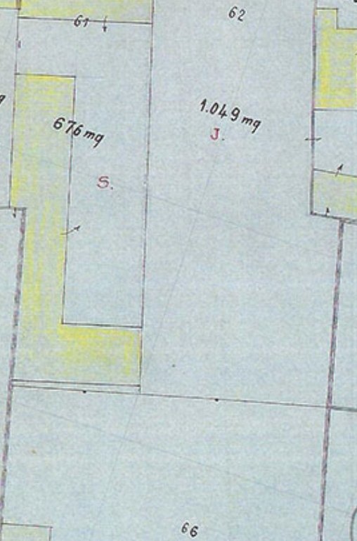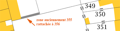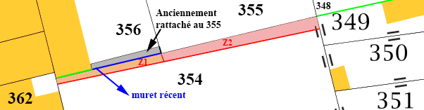 | Sur ces deux cartes, on voit qu'avant le remembrement de 1960, la limite des parcelles 355/354 était déjà dans le prolongement de celle des parcelles 349/348 (bien sûr, ce n'étaient pas encore ces numéros). On a évidemment confirmation que l'ancienne clotûre ou le mur ancien prétextés pas le promoteur pour s'accaparer une partie du terrain voisin n'étaient qu'inventions.