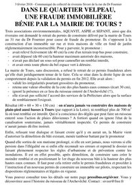 - Début novembre 2016 : les associations SEPANT, ASPIE et AQUAVIT demandent au Maire de Tours que le permis de construire soit retiré pour cause de fraude. Celle-ci est démontrée dans un dossier de 29 pages Fraude et danger.