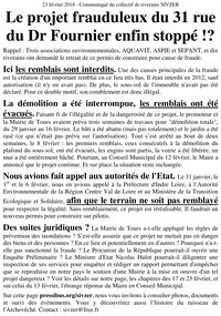 Le 10 février 2020. Après une semaine d'arrêt, la reconstruction est repartie... En ce qui concerne l'appel de la condamnation à payer 87 000 euros au promoteur pour recours soi-disant abusif, le promoteur ne réclame plus 1.000.000 euros (un peu plus) à 5 riverains et à l'association AQUAVIT mais 500.000 euros (un peu plus). La date d'audience, un temps fixée au 3 février, est reportée au 5 octobre 2020. L'instruction au pénal se poursuit et, comme indiqué précédemment, la Mairie continuant à soutenir le projet, un recours a été déposé devant le tribunal administratif...