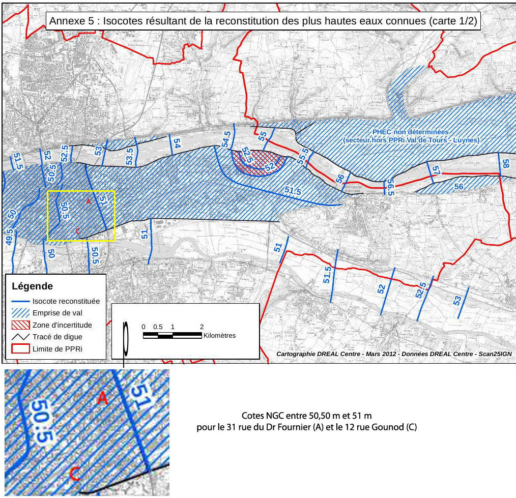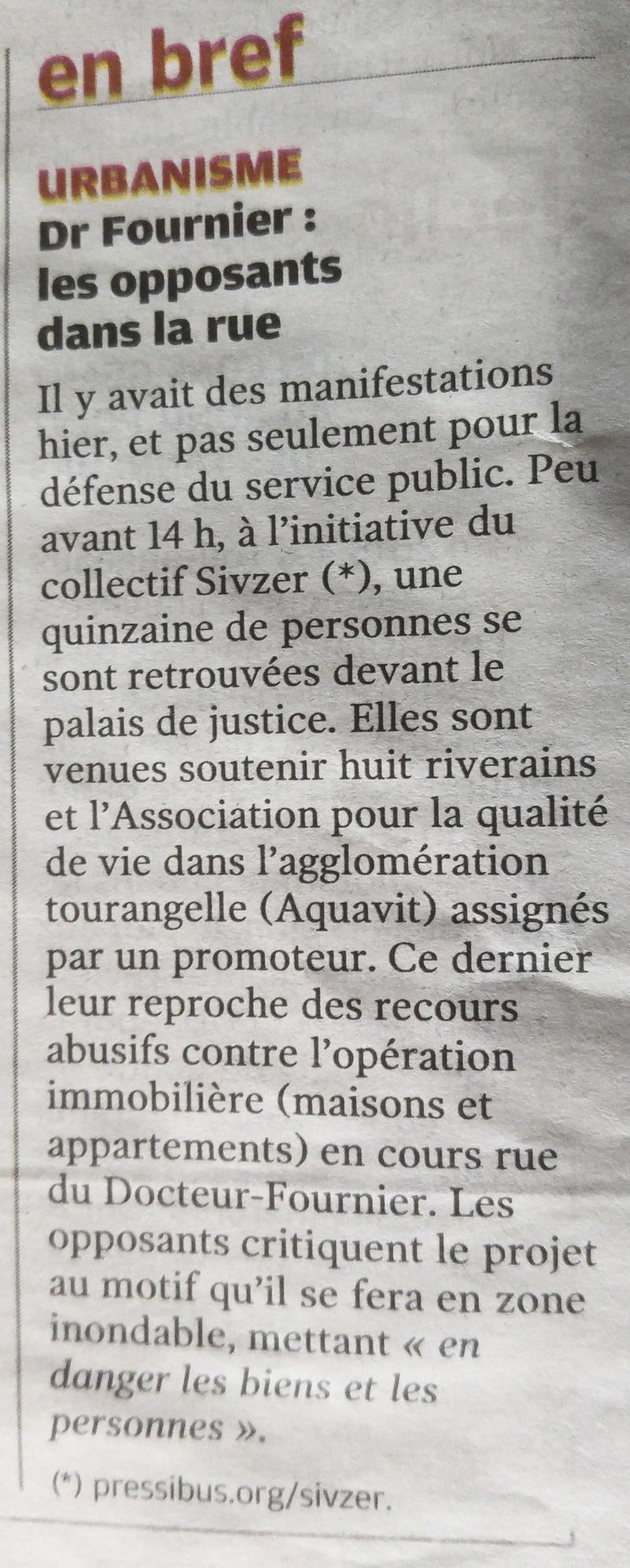 Fin 2012, pour un projet immobilier au 31 rue du Dr Fournier à Tours, sans consulter l'indispensable accord de la DDT à cause de la surface des remblais, un promoteur obtenait le permis d'édifier trois maisons en une zone trop basse pour les construire. Il trichait notamment sur les cotes, le bornage, la présence de caves... Le 12 février 2018, M. Bouchet, Maire de Tours, déclarait en conseil municipal, que la hauteur était bonne et : "Ce permis de construire a été accepté, il est définitif". Il savait pourtant que le 1er étage ne pouvait pas atteindre la cote des plus hautes eaux connues et que les importants remblais y sont interdits. Trois associations (SEPANT, ASPIE, AQUAVIT) ont demandé au Maire le retrait du permis pour fraude et dangerosité. Il a refusé, alors qu'il est "tenu" de le faire selon une jurisprudence. Malgré cela, la construction a démarré en occupant une bande de terrain d'une parcelle voisine, nouvelle fraude grossière contre laquelle le Maire a, là encore, refusé d'agir. La résistance des riverains et une action en justice ont contraint le promoteur à reculer de 1,60 m ses maisons. Cette remise en cause importante du permis aurait dû provoquer un retrait du permis, ou pour le moins un permis modificatif. La Mairie a refusé.