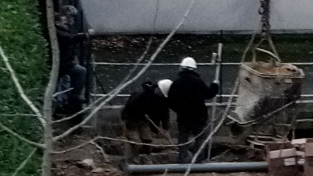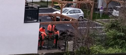 Même le promoteur a de gros ennuis. Le 4 février dernier. durant tout l'après-midi, cinq ouvriers on fait un large trou dans le bitume, sont intervenus apparemment sur l'équipement hydraulique, puis ont re-bitumé et évacué les déchets. Les trois maisons sont heureusement encore inhabitées. Photo :