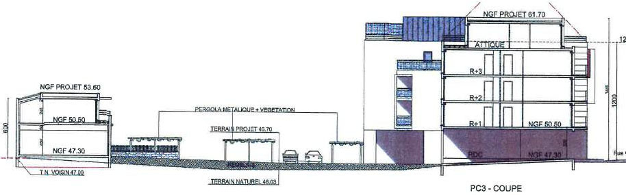 Coupe PC3 de la demande du permis de construire avec les maisons de ville en fond de jardin à gauche (sud) et l'immeuble sur rue à droite (nord).
