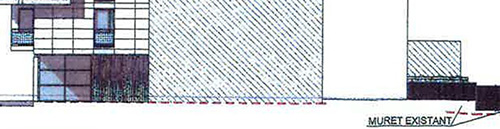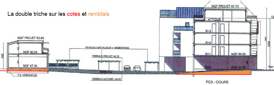 Rappel pour les personnes passant devant les lieux : on se rend facilement compte, en comparant avec le parking voisin, que le fond du jardin n'était pas à hauteur de la rue, comme le prétend la coupe PC3 du permis de construire.