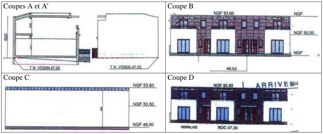 Les cotes indiquées correspondent à celles de la coupe B, mais pas aux A et A', puisque le socle du rez-de-chaussée à 47, 00 m en A et A' est ici en dessous de 46,80 m.
