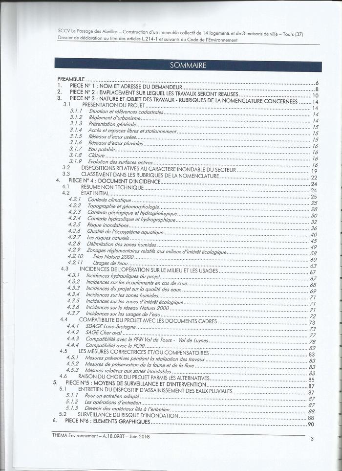 Le 27 mai 2019. Nous prenons encore connaissance de nouveaux éléments. En particulier, le promoteur ne pouvait pas commencer à construire avant juin 2018 pour deux raisons : d'abord il n'avait pas finalisé le bornage puisque le procès-verbal de "bornage amiable" n'a été terminé que le 31 mai et n'a été soumis à accord des riverains que de juillet à septembre 2018 ; ensuite parce que la préfecture avait interdit tout début de travaux tant qu'il n'y aurait pas autorisation de la DDT 37 quant à la "Loi sur l'Eau", dont la demande n'a été réceptionnée en préfecture que le 15 juin 2018. Cela montre que le retard est imputable au seul promoteur ; et aussi que les riverains avaient pleinement raison en soulignant que la DDT n'avait pas été consultée, ce qui constituait un des premiers motifs de recours. Le 7 juin 2018, dans l'ignorance de ces faits, le TGI de Tours a condamné cinq riverains et une association à payer 87 000 euros pour un retard qu'ils n'ont pas provoqué. La date d'audience pour l'appel, avec de nombreux et importants autres nouveaux éléments présentés ci-avant, n'est pas encore fixée.