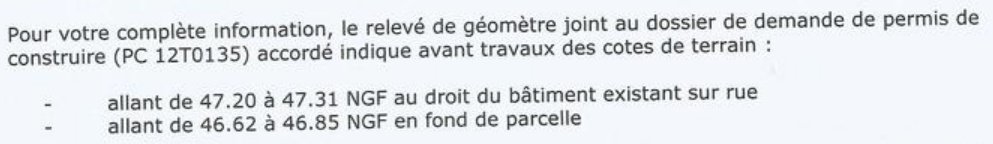 0,70 m par rapport aux TN Voisin de 46,60 m, on arrive à 6,20 m, ce qui reste excessif. L'acceptation par le service