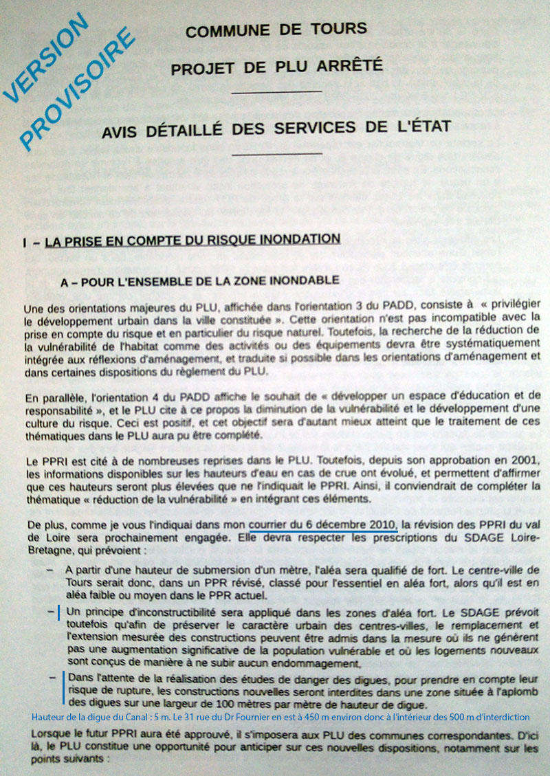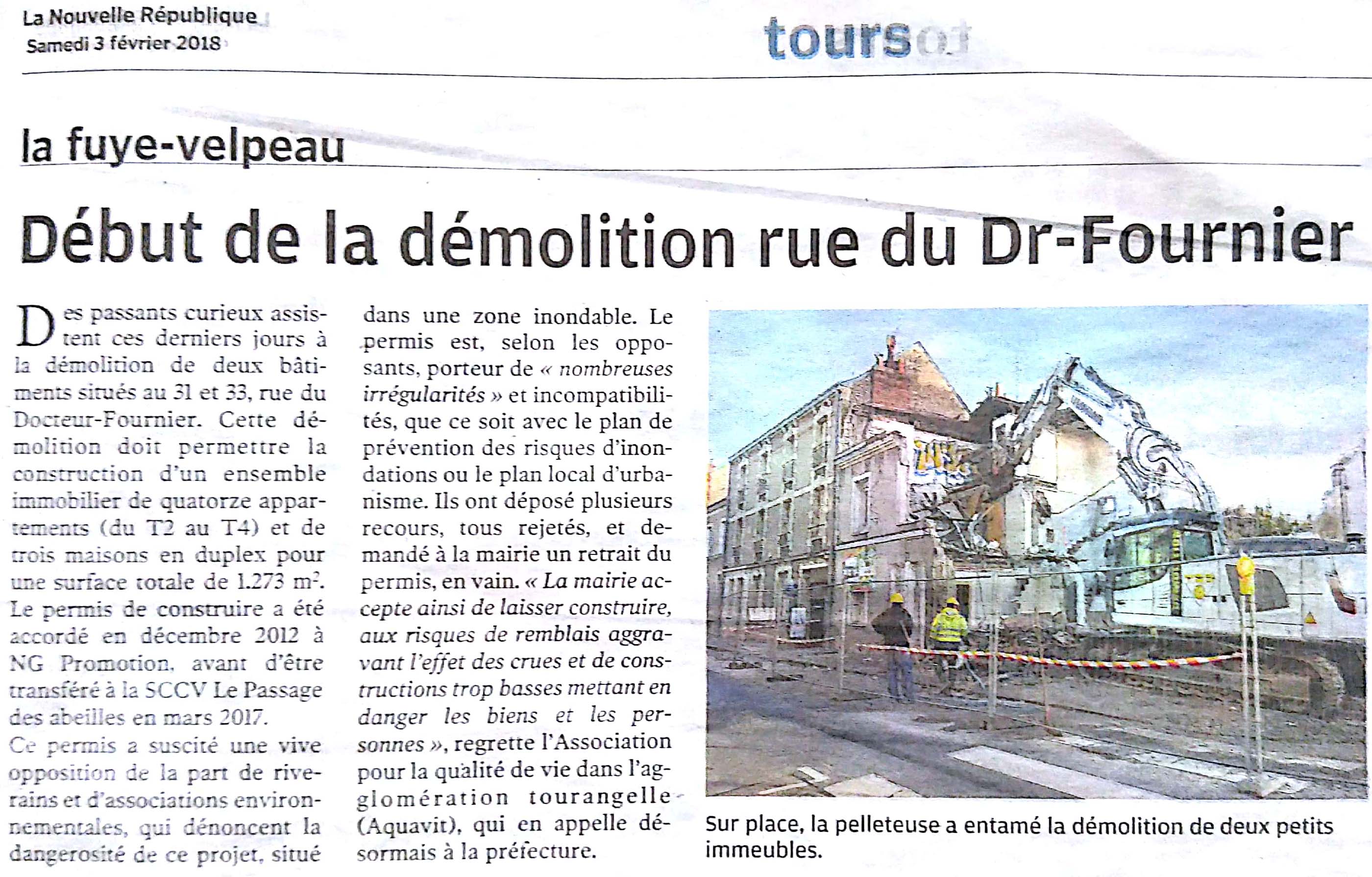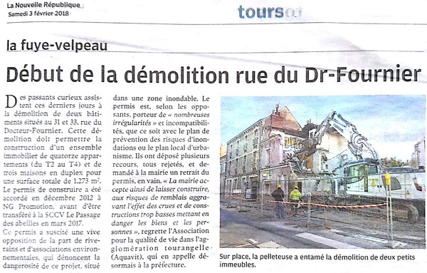 En 2010, la catastrophe de la Faute sur Mer a pointé la culpabilité d'une mairie qui n'a pas respecté les mesures de protection contre les inondations dans la délivrance de ses permis de construire. Malgré des règles renforcées depuis 2010, la Mairie de Tours a fermé les yeux et a refusé d'agir quand un promoteur a triché pour construire là où il n'a pas le droit, au 31 rue du Dr Fournier, dans le quartier inondable Velpeau, en l'un des points les plus bas de la ville.