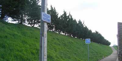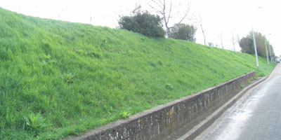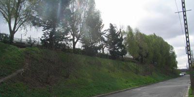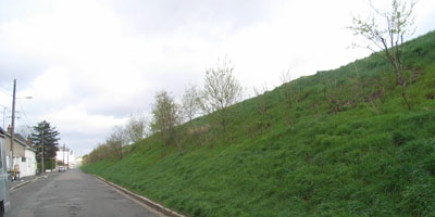 Une rangée de petits arbres. Le talus n'est pas trop pentu et pourrait aussi acceuillir des arbres.