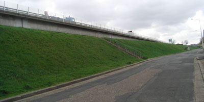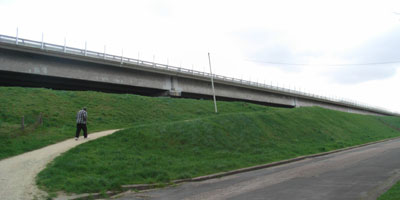 Une belle rangée de conifères encore jeunes. Là aussi, il serait intéressant de densifier le talus avec des arbres ou arbustes. Au bout le pont du milieu. Il est à signaler que la présence de cette rangée, pourtant encore peu épaisse, a diminué le bruit dans le voisinage de façon palpable, sans que ce soit pour autant vraiment significatif. Il convient donc de perséverer en ce sens.