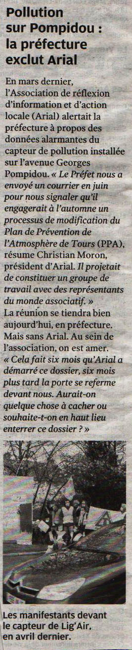 Dans la Nouvelle République du 30 septembre, un article (ici) indique que l'association ARIAL n'est pas invitée en préfecture à participer au groupe de travail traitant le processus de modification du Plan de Prévention de l'Athmosphère (PPA) de Tours. C'est surprenant...