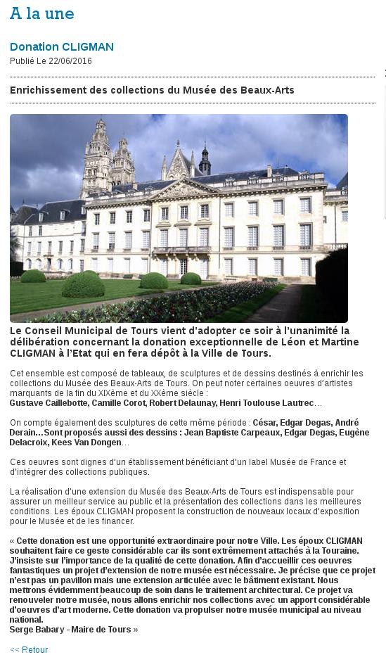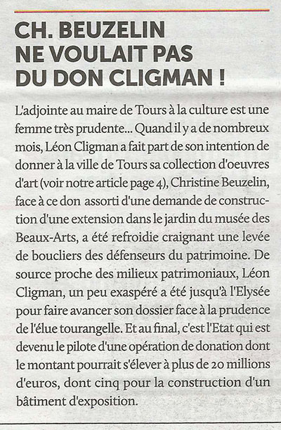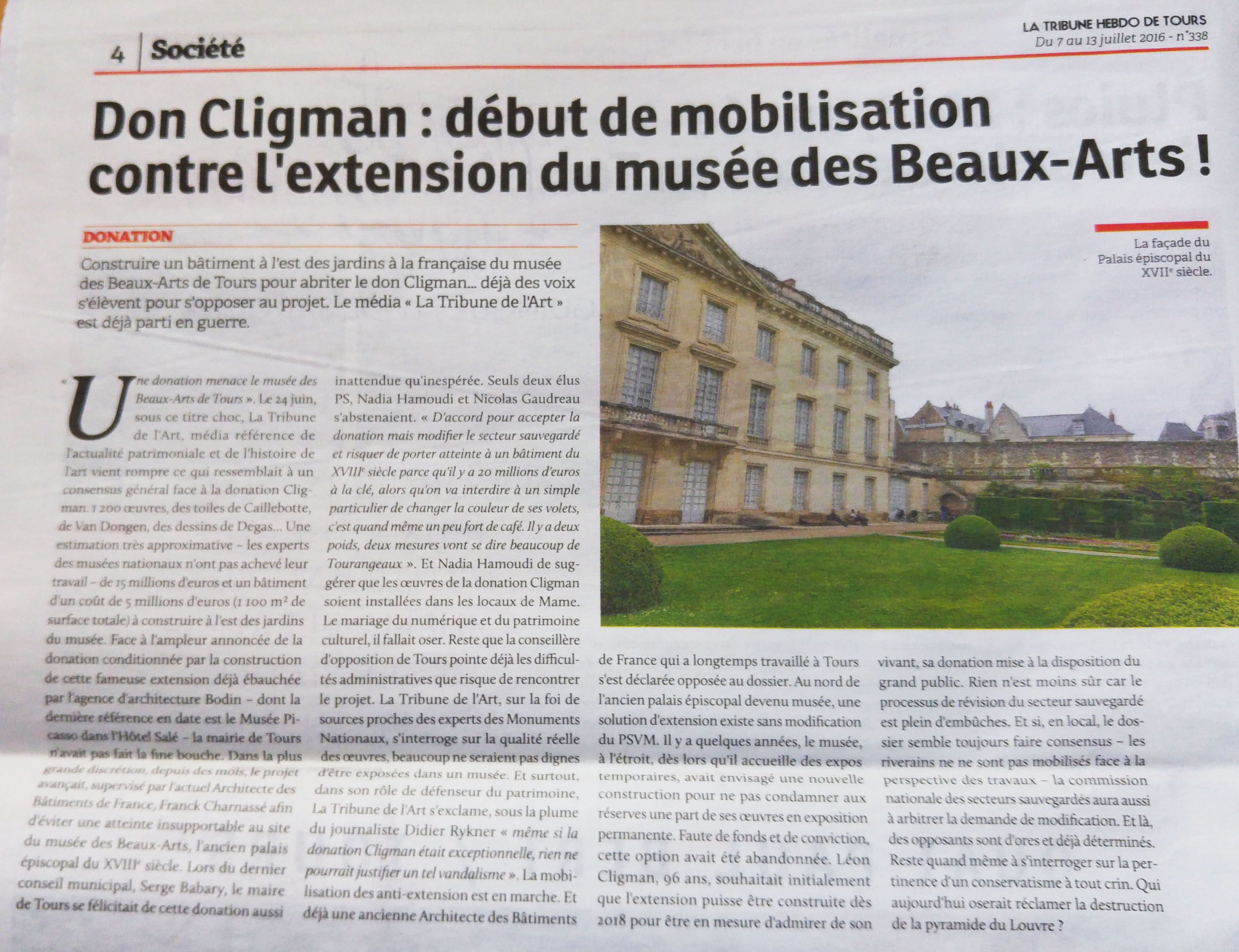 [Complément du 7 juillet 2016]. La Tribune de Tours du 7 juillet publie la notule ci-contre . Ainsi, c'est bien l'industriel Léon Cligman qui a insisté pour que le jardin des Beaux-Arts soit partiellement détruit, allant jusqu'à obtenir l'appui du Président de la République François Hollande et de l'Etat. On comprend pourquoi, deux ou trois jours avant l'acceptation du Conseil Municipal le 21 juin, la mairie a présenté le projet à quelques privilégiés, notamment trois associations patrimoniales, pour essayer de les amadouer... Quoiqu'il en soit, il est rassurant de constater que, derrière l'unanimité de façade, il y a au moins une élue, la conseillère municipale Christine Beuzelin, qui n'est pas tombée dans l'approbation béate d'un projet très constestable. |