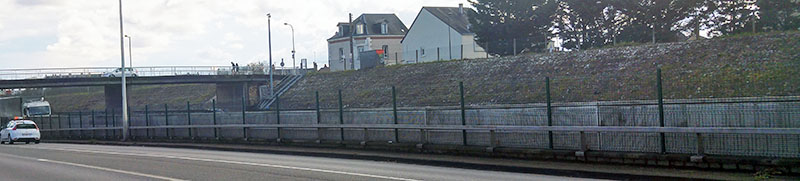 La digue du Canal, solidement empierrée, ici à hauteur du pont du Milieu, borde l'autoroute A10.