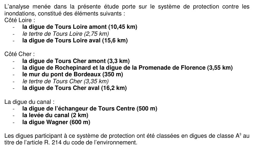 - A lire le jugement du Tribunal d'orléans, on pourrait croire que la digue du Canal n'existe que pour protéger la commune de Tours d'une inondation d'amont de la Loire, ce qui correspond au scénario n°1 de l'étude de danger de 2013. Or elle protège aussi, dans le même scénario la commune de La Riche, voire plus à l'ouest, et dans le scénario n°2 d'inondation par l'aval de la Loire, elle protège les communes de Saint Pierre des Corps, et ses sites SEVESO, et La Ville aux Dames, même s'il reste un risque de rupture. Et il y a d'autres scénarios d'inondation par le Cher. En éludant ces cas de figure, le tribunal se positionne de la même façon que l'Atelier National et la Préfecture, seulement dans le cas le plus grave d'inondatoin par l'amont. Retenir les autres scénarios d'inondation moins exceptionnels permettait de reconnaître l'utilité de la digue.