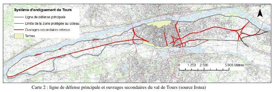 - Pourtant, cette logique de mise en transparence des digues de second rang n’est pas généralisée sur la France entière. Deux digues de second rang vont par exemple être construites dans l’Hérault (département 34 dans le Sud de la France) sur les communes de Lunel et de Marsillargues. Cette décision prise en 2015 sert à « réduire les conséquences des débordements contrôlés (surverse) » et servirait de protection supplémentaire (arrêt préfectorale, 2015). La digue du Canal a également joué ce rôle de protection supplémentaire lors de la crue de 1866 en épargnant la ville de Tours et l’aval du Val. Ne peut-on pas ici y voir un double discours ou un discours contradictoire à l’échelle nationale de la part de l’Etat ? (page 57)