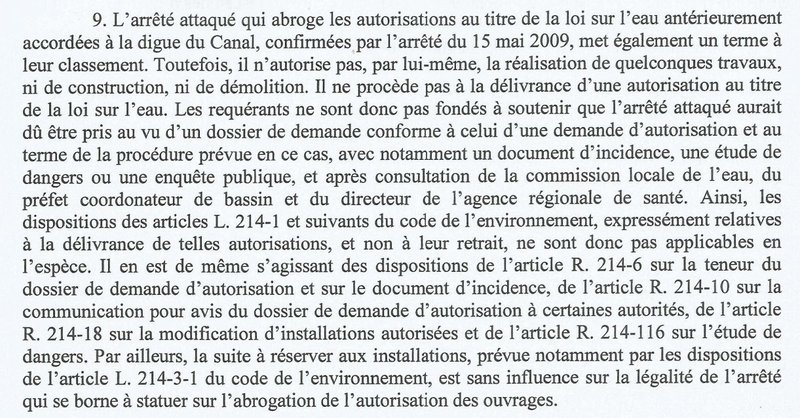 - (13 et 14) Le code de l'environnement impose un dignostic de sûreté, mais le préfet, "sans commettre d'erreur", "a pu estimer que la digue du Canal n'avait plus vocation à assure un rôle de digue de protection". De façon arbitraire, contrairement à la conclusion de l'étude de dangers, le préfet s'est donc dispensé d'un dignastic qui n'a jamais été fait pour interpréter à sa façon les "options proposées par l'étude de dangers". De plus, l'article R214-146 du code de l'Environnement confie ce dignostic à un organisme indépendant, alors l'étude de dangers a été effectué par l'Etat.
