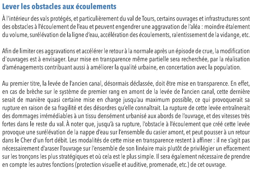 - (9) L'arrêté "n'autorise pas, par lui-même, la réalisation de quelconques travaux, ni de construction, ni de démolition". Cela signifie que, malgré que l'arrêté l'estime préconisée "à court terme", la "mise en transparence" de la digue n'est pas autorisée par l'arrêté. Il y a même lieu de s'interroger sur le refus du maire de Tours, dans sa lettre au préfet du 9 juillet 2015, de mettre en place les batardeaux en cas de danger. Est-ce assimilable à de la "destruction" ?