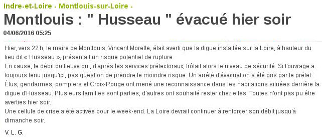 De plus, les récentes inondations de ce début juin 2016 ont montré qu'une rupture de la digue de la Loire en amont de Tours, à hauteur du village de Husseau, était possible, même pôur une crue d'assez faible ampleur. Les habitants de ce village ont même été évacués. Ce n'était qu'une "petite inondation", davantage sur le Cher que sur la Loire. Elle n'aurait pas fait monter l'eau à 52 m au niveau de la digue du Canal ! Mais sans cette digue, cela suffirait à inonder les caves de plusieurs quartiers de Tours...