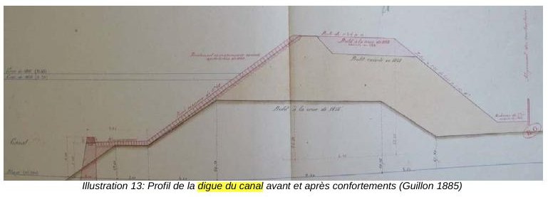 (haut de la page 59) "Depuis cette époque (1860/1870) la digue n'a plus été renforcée". C'est d'abord oublier que la digue du Canal a été renforcée au début du XXème siècle. C'est ensuite ignorer qu'elle l'a aussi été dans les années 1960/1970 lors de la création de l'autoroute A10 avec de nombreux remblaiements, à tel point qu'à deux endroits l'autoroute est plus haute ou aussi haute que la digue !!