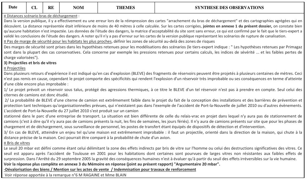 Les périmètres de forme triangulaire (300 m, 500 m, ...) évoqués n'ont pas été tracés ni présentés par Primagaz. Ils ne représentent pas des zones de dangers (une zone de danger n'épouse pas la forme des limites d'un site). Ils permettent de visualiser l'environnement du site. Les distances des dangers potentiels liés au relais-vrac sont bien celles indiquées dans le dossier de demande d'autorisation, reportées sur les cartographies.