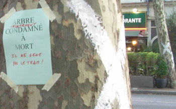 Oui, ça suffit, arrêtez tout cela, rendez-vous compte que nous pourrons plus tard signaler où se trouvaient ces arbres et que chacun pourra se rendre compte qu'ils n'auraient pas gêné le tram. Sauvez les platanes de Jean Jaurès et tant qu'à faire, infléchissez un tout petit peu le tracé au carrefour de Verdun pour sauver le beau cèdre (cf. ici).