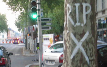 Le CODAT (Collectif d'Organisation et de Défense des Arbres de Touraine) a pris corps au mois de mars et a défendu, comme il pouvait, les érables et marroniers du mail du Sanitas. Ce 25 avril, il est intervenu pour les platanes qui doivent être abattus entre la place Jean Jaurès et la rue Charles Gille. Sur les troncs, pose d'affichettes, inscriptions au platre de croix blanches et de sigles R.I.P. (Requiescat In Pace, Rest In Peace, Repose en paix), les passants vont apprendre ce qui va se passer et que leur cachent la mairie et la Nouvelle République.